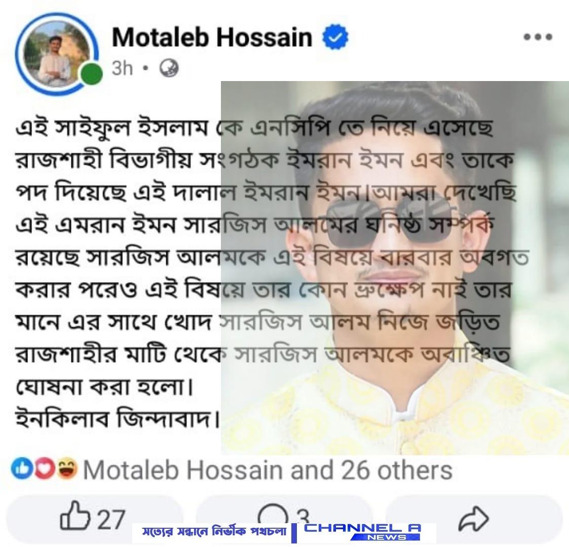 তিনি লিখেন— “এই সাইফুল ইসলামকে এনসিপিতে এনেছে রাজশাহী বিভাগীয় সংগঠক ইমরান ইমন এবং তাকে পদও দিয়েছেন তিনি। আমরা দেখেছি, এই ইমরান ইমনের সঙ্গে সারজিস আলমের ঘনিষ্ঠ সম্পর্ক রয়েছে। সারজিস আলমকে বারবার অবগত করা হলেও তিনি কোনো পদক্ষেপ নেননি।”
