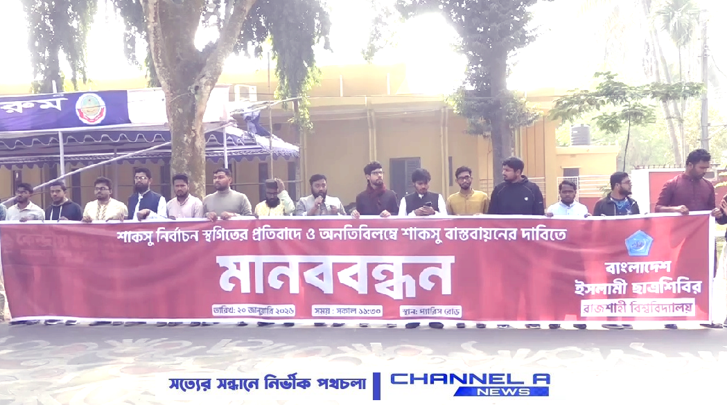 রাজশাহী বিশ্ববিদ্যালয়ে (রাবি) শাকসু নির্বাচন স্থগিতের প্রতিবাদে এবং দ্রুত শাকসু নির্বাচন বাস্তবায়নের দাবিতে মানববন্ধন কর্মসূচি অনুষ্ঠিত হয়েছে। মঙ্গলবার (২০ জানুয়ারি) বেলা সাড়ে ১১টায় বিশ্ববিদ্যালয়ের প্যারিস রোডে বাংলাদেশ ইসলামী ছাত্রশিবির, রাজশাহী বিশ্ববিদ্যালয় শাখার ব্যানারে এ কর্মসূচি পালন করা হয়।