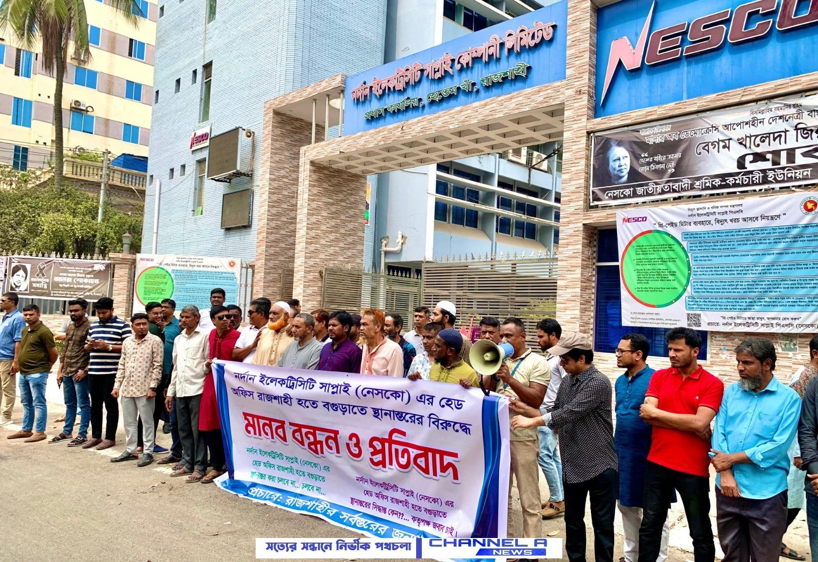 নেসকোর প্রধান কার্যালয় বগুড়ায় স্থানান্তরের প্রতিবাদে রাজশাহীতে মানববন্ধন রাজশাহীতে হেড অফিস রাখার দাবি, সিদ্ধান্ত বাতিলের আহ্বান রাজশাহীতে অবস্থিত নর্দান ইলেকট্রিসিটি